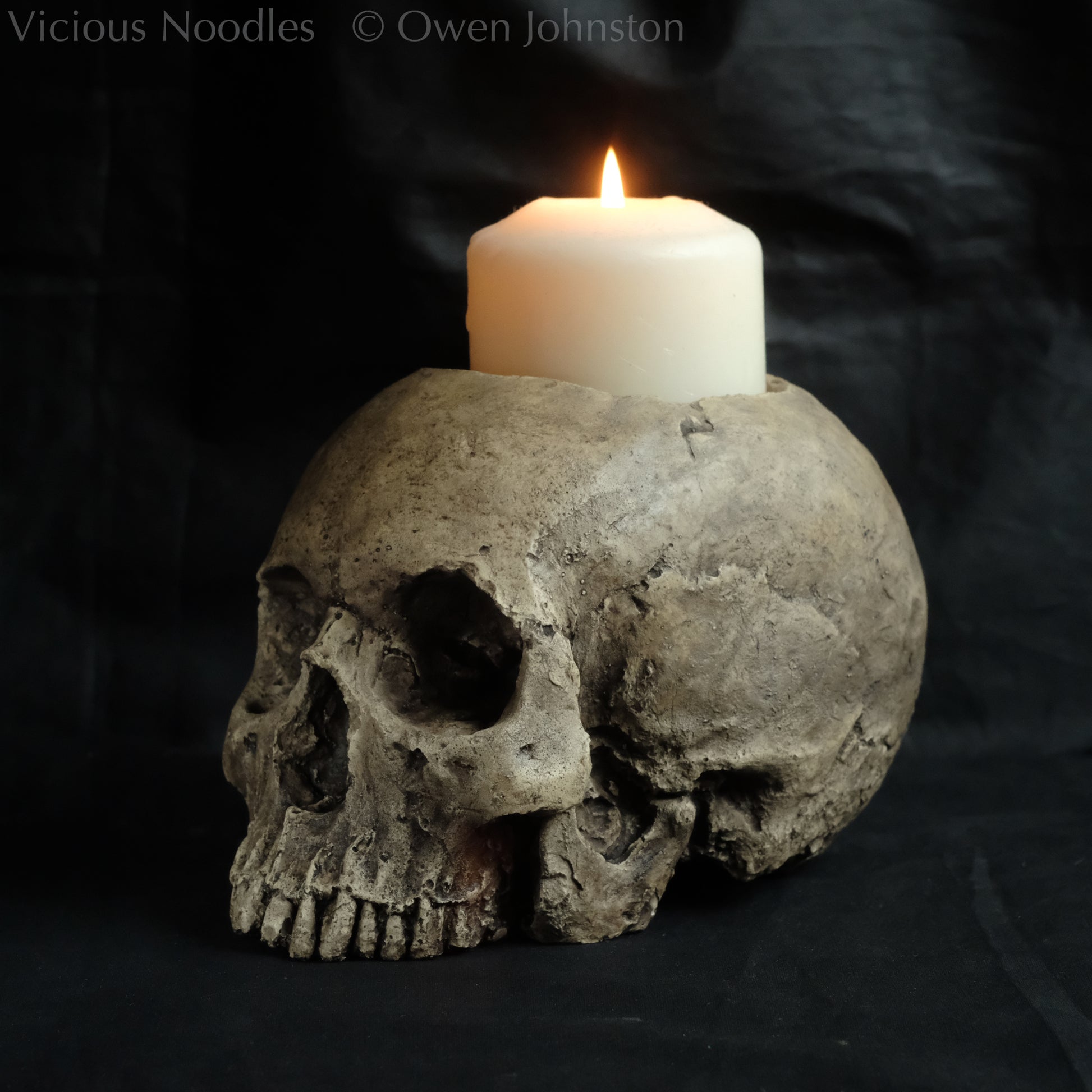 This detailed and realistic life size human skull candle holder is handmade from polymerised plaster (fine, hard plaster of Paris mixed with an acrylic polymer which makes a material similar to a resin). It is painted and lacquered for a weathered appearance.