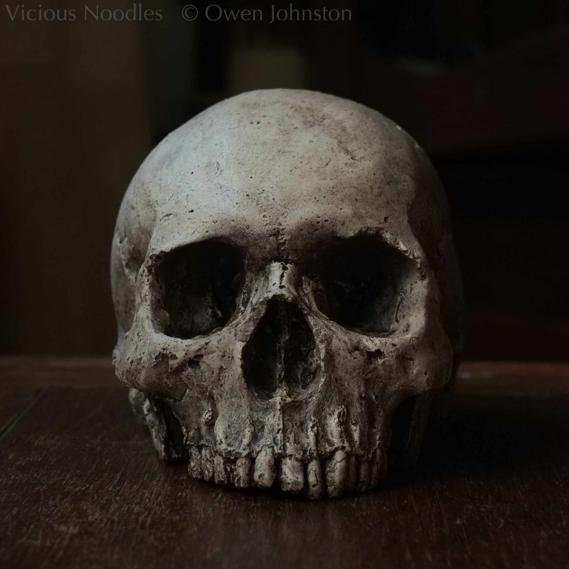 Human skull replica, highly weathered natural finish
