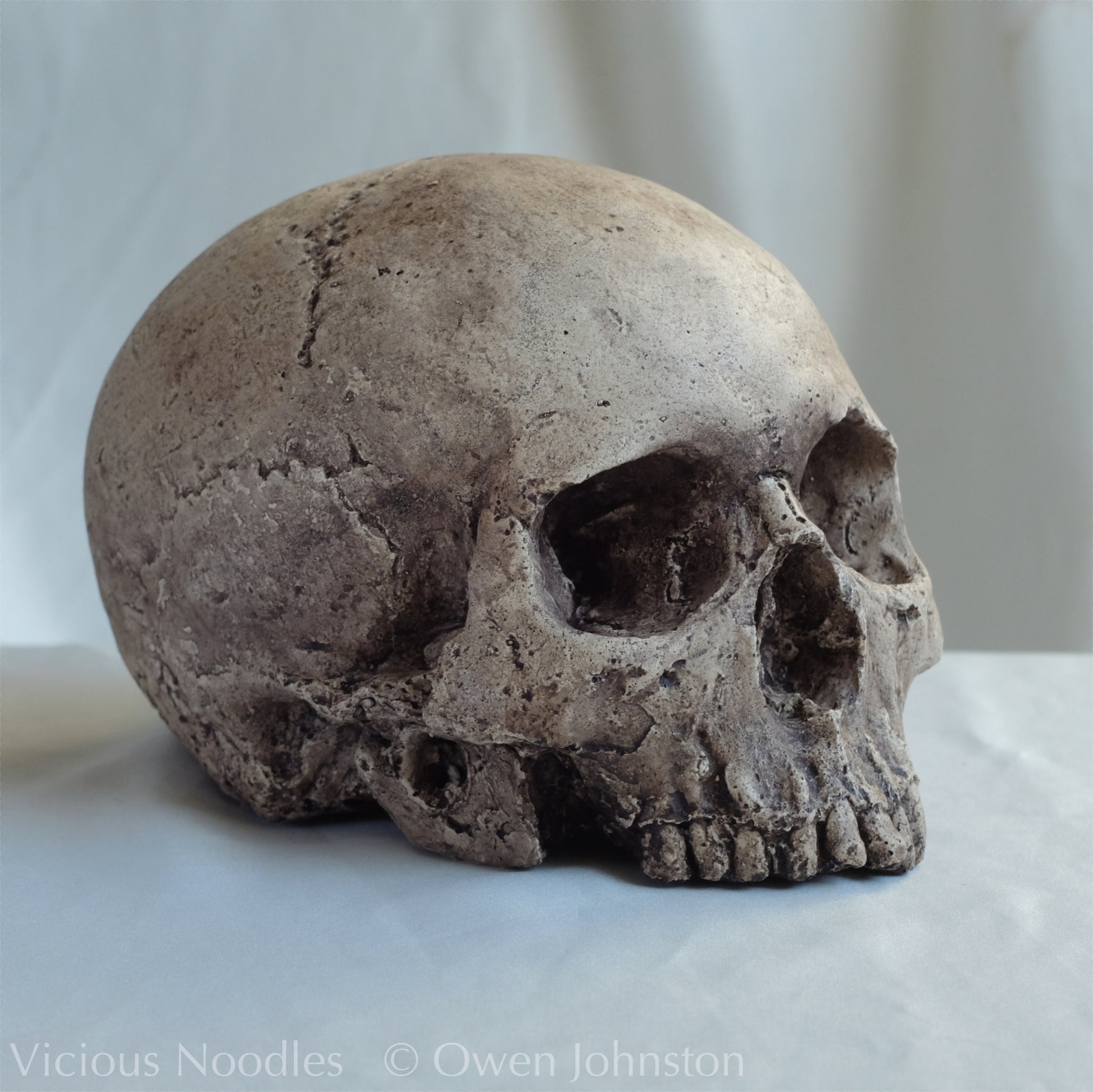 This detailed and realistic life size human skull replica is handmade from polymerised plaster (fine, hard plaster of Paris mixed with an acrylic polymer which makes a material similar to a resin). It is painted for a highly weathered finish.