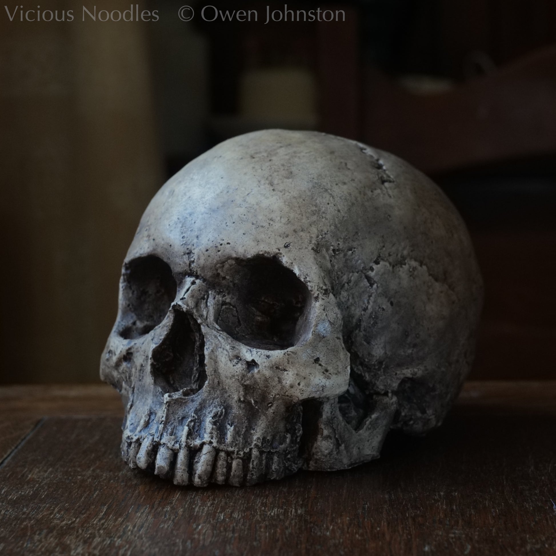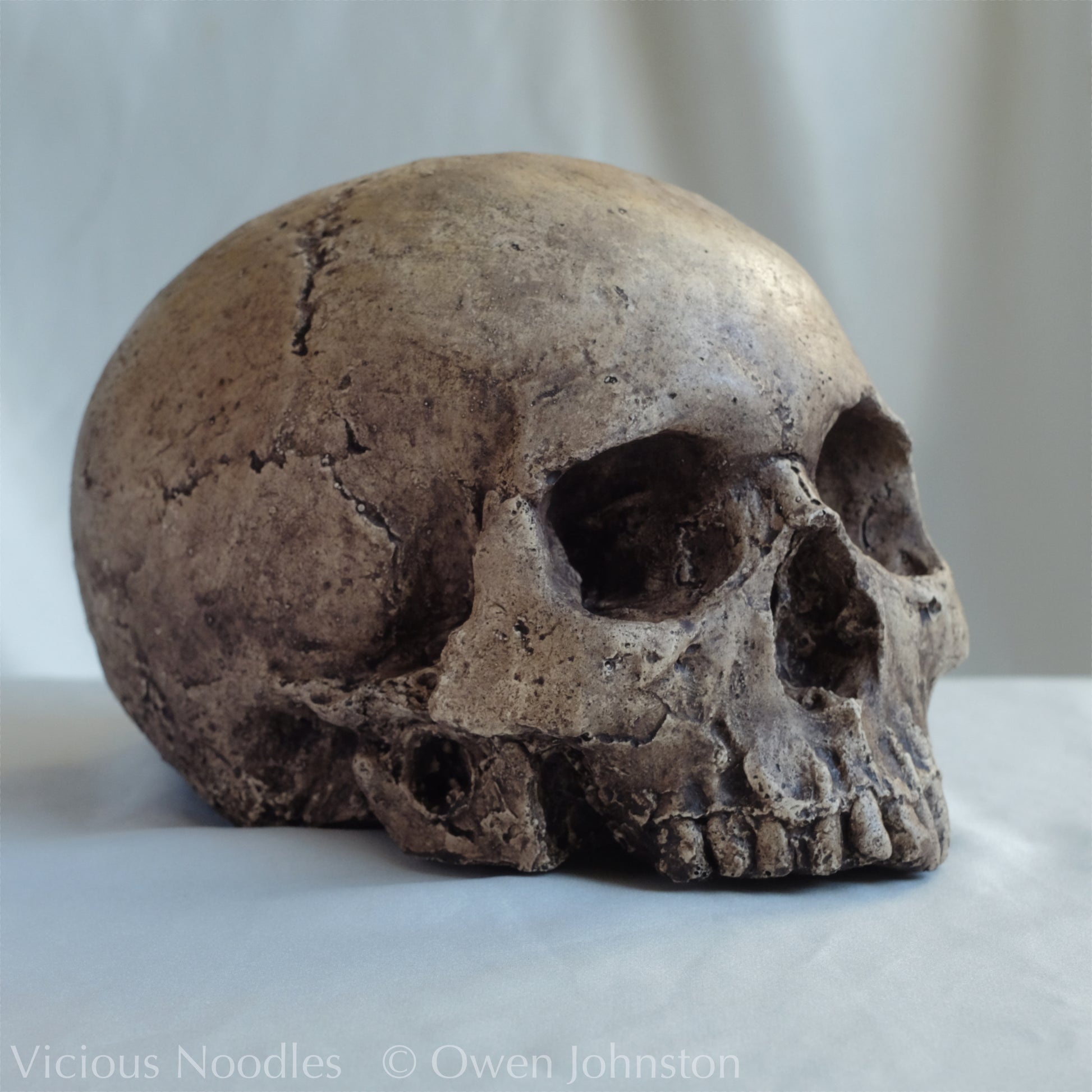 This detailed and realistic life size human skull replica is handmade from polymerised plaster (fine, hard plaster of Paris mixed with an acrylic polymer which makes a material similar to a resin). It is painted for a highly weathered finish.