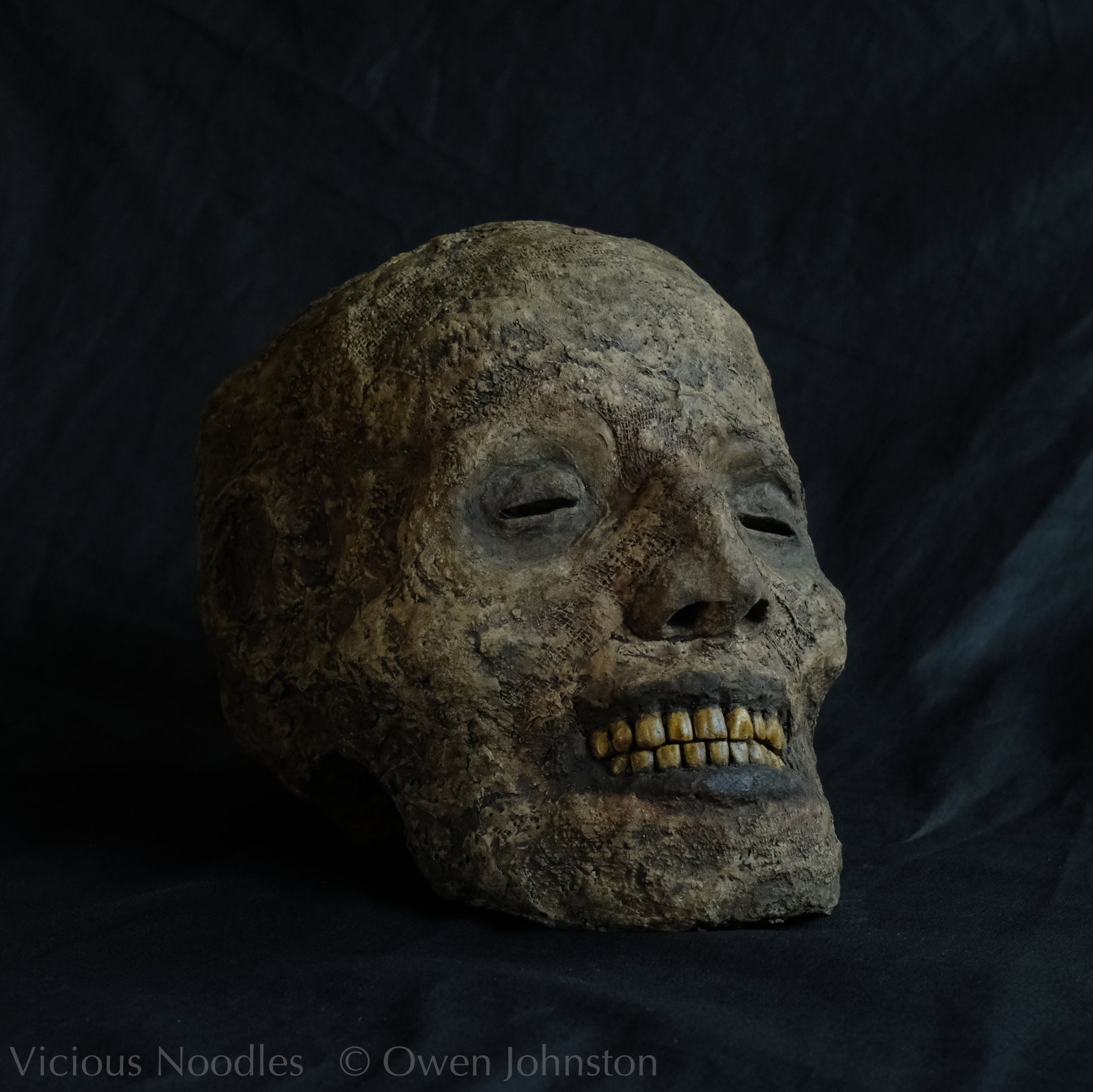 This replica mummified head is handmade from polymerised plaster (very hard casting plaster mixed with an acrylic polymer to create a material similar to a resin). The use of a rubber mould combined with this material means that textures such as cloth, skin, bone etc are faithfully reproduced, this detail is further enhanced by painting which is applied in multiple layers for depth and realism.